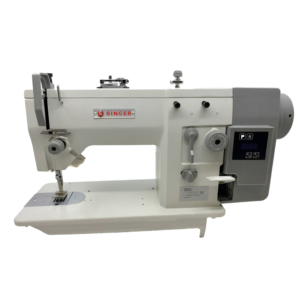 Máquina de zig-zag de doble pespunte con motor directo cabezal, costura recta semi industrial, con ancho máximo de costura de 12 mm. Con sistema de lubricación manual.