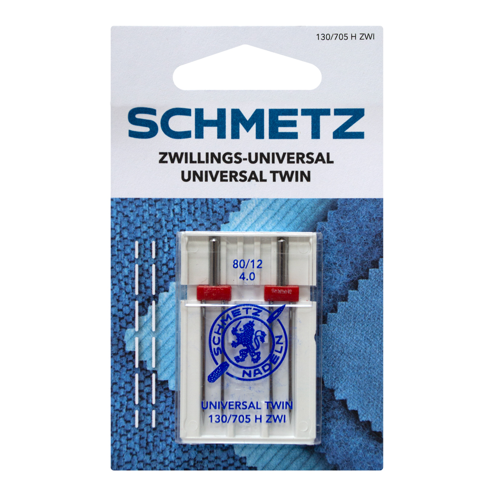 Aguja gemela con punta apenas redondeada, una gran aguja para múltiples usos con puntada recta, zigzag o decorativas. En estas últimas, se recomienda siempre hacer pruebas con el volante de la máquina; es decir, sin pisar el pedal para comprobar que la aguja no choque con el pie.